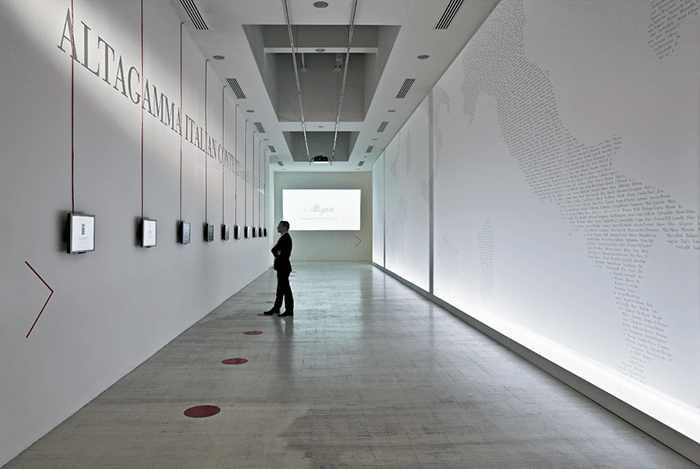 At the entrance a long lit corridor guides the visitors in a “trip throughout Italy”: a continuous surface of light forms the background of a black & white graphics about made in Italy, while on the opposite side 10 monitors talk about the philosophy of the brands through images and texts.