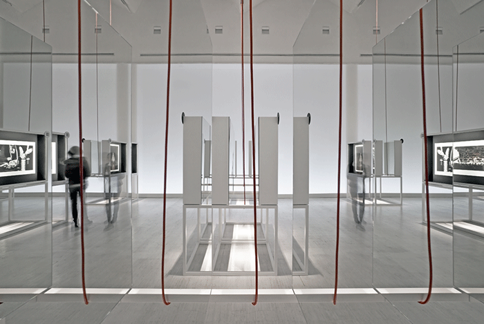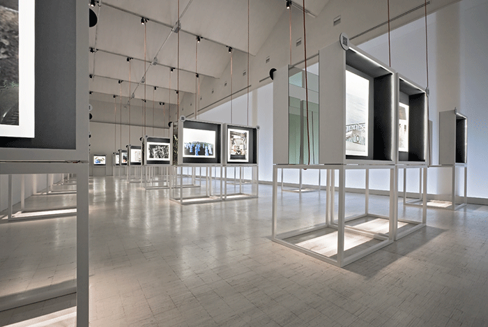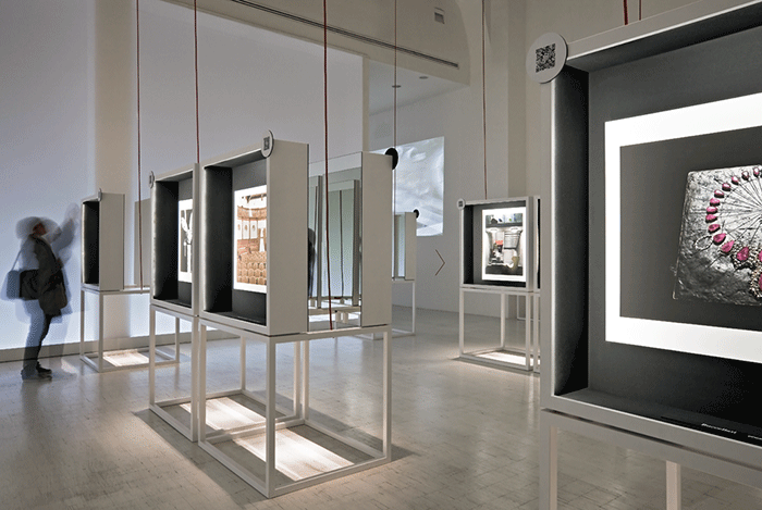 The cases have been designed, in their shape and disposition, as a sort of tridimensional layout within a big white page, to define an overall scenario about the Italian manufacture and industrial excellence.