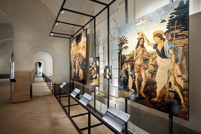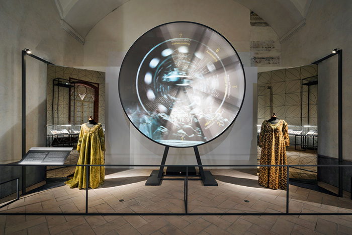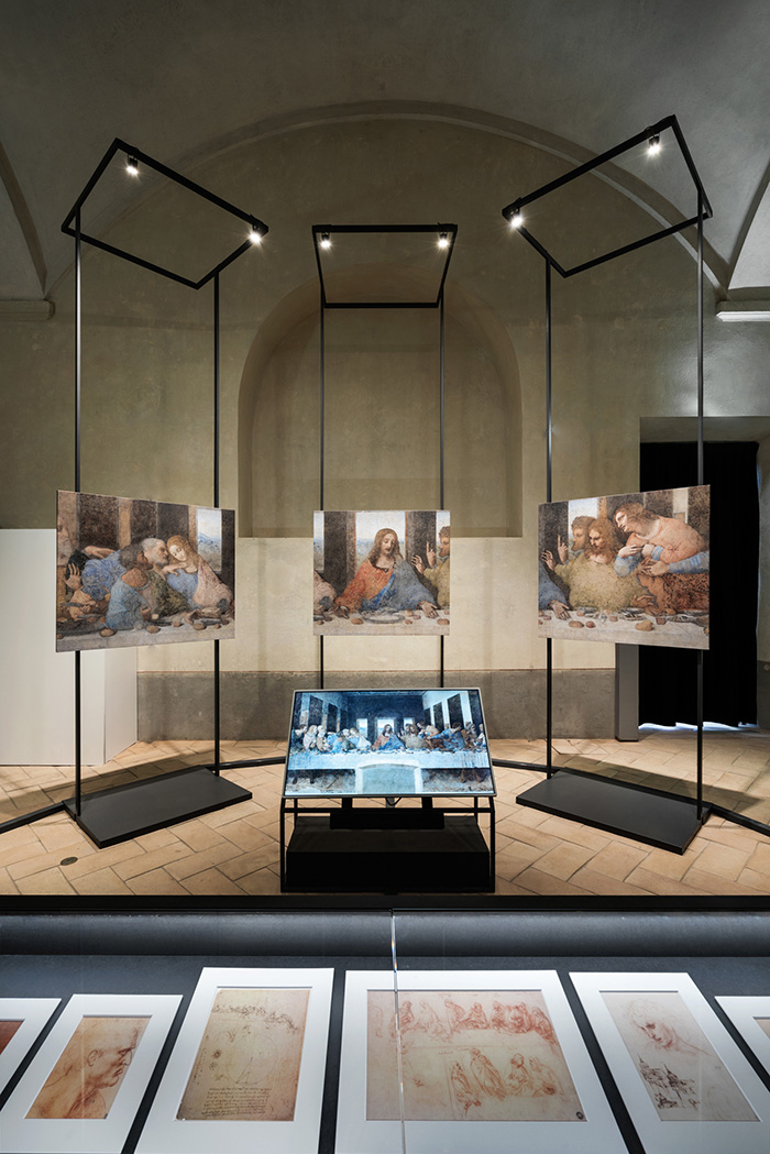 “We worked on reversed relationship between vessel and content, between original piece, replica and narration, to make the exhibited subject become the thought and the action of Leonardo inside the original scene. In a rich dialogue with the historical rooms of the castle, the exhibition develops through light installations and structures that combine interactions and advanced technologies to build new narration scenarios.”