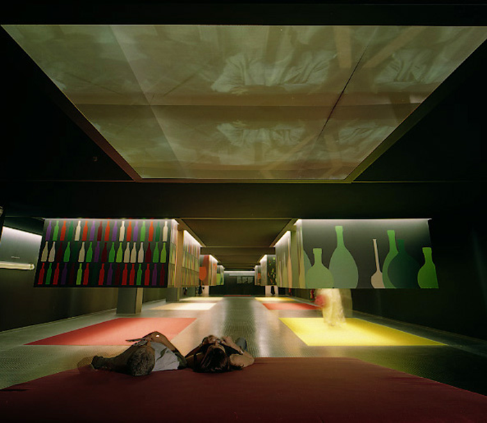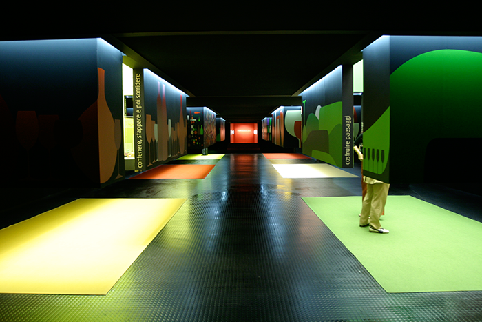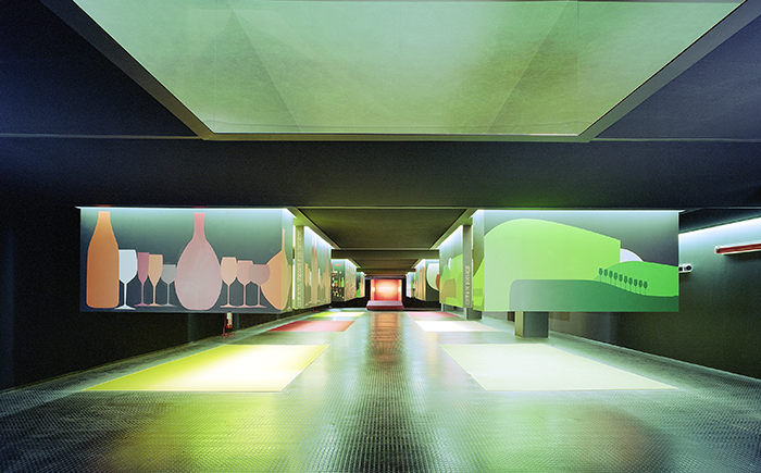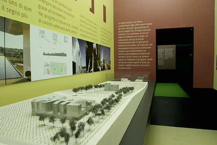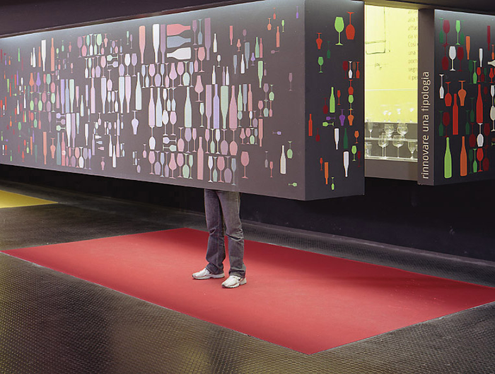 The exhibition develops, through several modules and the division in thematic universes to be explored, along a pathway that starting from a suggestion on the territory, marks, as a vineyard, the space. From the wine cellars designed by the most important architects, to wine tools and “accessories” that have made the history of design, this exhibition leads to an imaginary world, to the projections on the ceiling that make people look up, as opposed to the usual underground wine cellar.