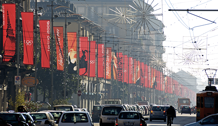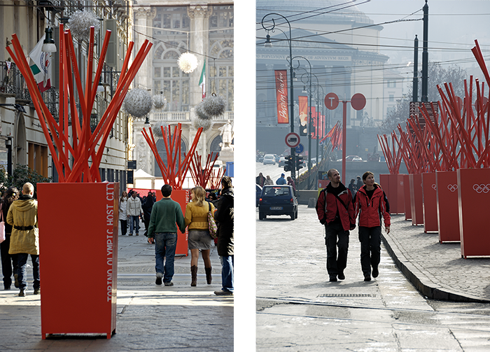 Look of the city” was designed by Italo Lupi Ico Migliore e Mara Servetto for the city of Torino for the Winter Olympics 2006. The project consistently uses a number of distinguishing elements in keeping with the city’s architectural and town-planning characteristics. A project affecting the entire territory, from the suburbs to the centre, bordering towns and villages as well as the Olympic valleys. The greatest and most widespread project ever for the corporate image of an italian city, this contributed to renewing the face of a beautiful town. Shanghais, Anemometers, precise and dynamic metal elements, banners and Menhirs, large structures with three-dimensional graphics. Networks of isolated episodes on a pedestrian and road scale, actually dialoguing with the most distant perspectives, salvaging a typical characteristic of the city on a vertical scale, “looking upwards”, from the Mole to the big avenues enclosed by the mountains or the hillside.