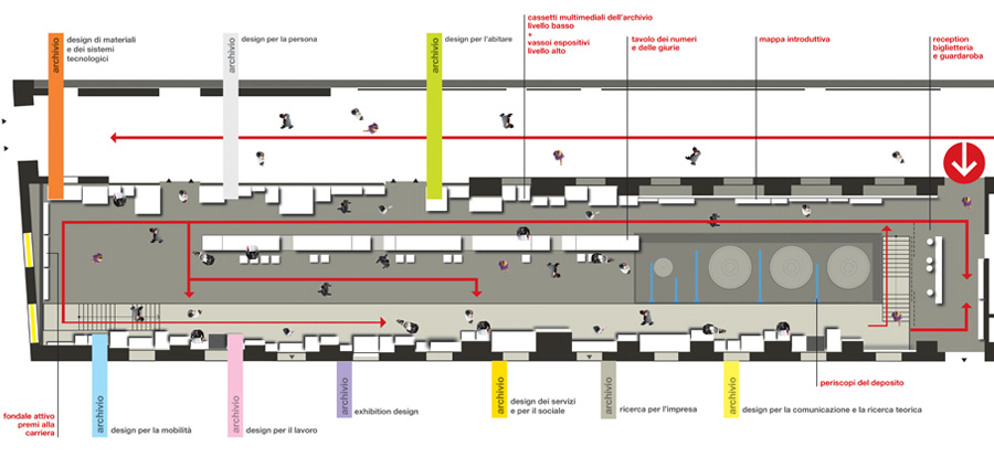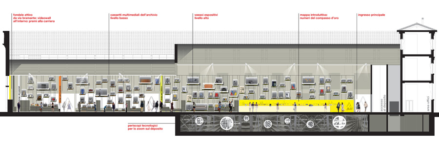 In the project all the pieces of the collection are visible and allow the visitor to make a cross trip in the world of design. A flexible project designed for a variable density, that can change in time, with the awarding of other prices. A light sign that identifies with a sort of great “archive chest of drawers” the constant and flexible trait that supports and narrates.